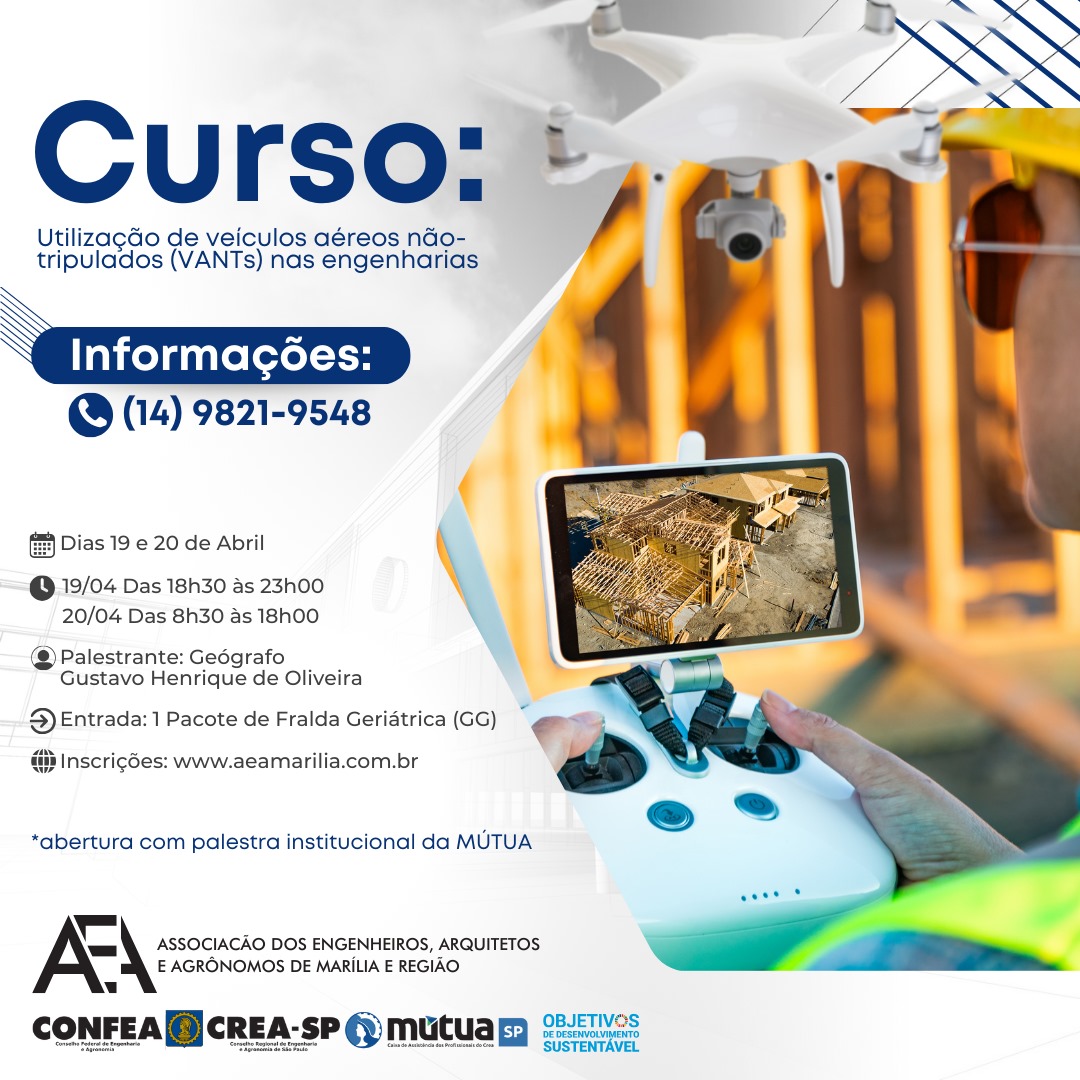 Inscrições já podem ser feitas no site da Associação dos Engenheiros, Arquitetos e Agrônomos de Marília, pelo link https://www.aeamarilia.com.br/eventos/1 por Agência Patmus Editorial A Associação dos Engenheiros, Arquitetos e Agrônomos de Marília (AEA Marília) está com inscrições abertas para o curso que irá ensinar a utilização de drones nas atividades da engenharia. ‘Utilização de veículos aéreos não-tripulados (VANTs) nas engenharias’, com o geógrafo Gustavo Henrique de Oliveira. Os associados já podem se inscrever através do site oficial da AEA Marília, pelo link https://www.aeamarilia.com.br/eventos/1, clicando na opção que corresponde ao curso ‘Utilização de veículos aéreos não-tripulados’. Para confirmar a vaga, é preciso fazer o login e se inscrever, conforme está descrito no quadro do treinamento. O curso será realizado nos dias 19 e 20 de abril, na sede da entidade, que fica na rua Mecenas Pinto Bueno, n.º 1207. No dia 19 o treinamento será no período das 18h30 às 23 horas, e no dia 20 de abril, no período das 8h30 às 18h00. A entrada será a doação de um pacote de fralda geriátrica (GG). Informações, (14) 9821-9548. O treinamento será precedido com uma palestra de abertura institucional sobre a Mútua São Paulo. [Agência Patmus Editorial - jornalista-responsável Ramon Barbosa Franco, Mtb 32.103]
