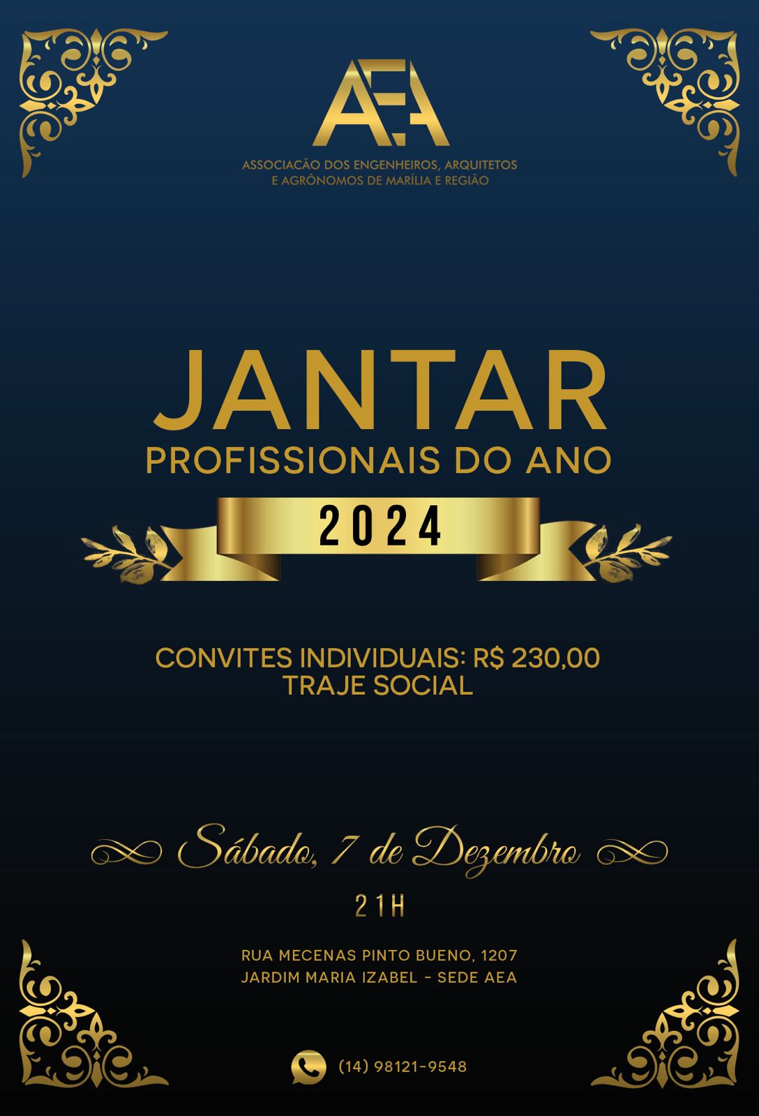 Tradicional noite vai entregar troféus de Engenheiro, Arquiteto e Agrônomo do Ano para eleitos pelos associados por Ramon Barbosa Franco, @ramonbarbosafranco Acontece no próximo sábado, dia 7 de dezembro, a partir das 21 horas, o tradicional jantar dos profissionais do Ano, da Associação dos Engenheiros, Arquitetos e Agrônomos de Marília, a AEA Marília. Eleitos pelos associados, os profissionais de 2024 foram apresentados à Imprensa no mês passado e na noite de gala de sábado a arquiteta Vera Lúcia de Carlo Oliveira, o agrônomo Michel Sudaia Filho e o engenheiro civil Cassiano Fogaça receberão o troféu Profissional 2024 da AEA. O evento é aberto ao público em geral e os interessados em adquirir os convites podem entrar em contato com a entidade, através do telefone (14) 98121-9548 ou com os diretores. O jantar será servido no salão social da associação, que fica na rua Mecenas Pinto Bueno, nº 1.207. O cardápio é formado por entrada (com mini gnocchi com molho ragu de linguiça, dadinho de tapioca com geleia de damasco, brandade de bacalhau, entre outros pratos); ilha de frios e antepastos (com gorgonzola com geleia de frutas vermelhas, parmesão com uva e damascos, provolone, brie, salame italiano, palmito, salpicão de frango, entre outras opções), pratos quentes (com batatas rústicas, tornedor de mignon ao molho cabernet, sofiatelli quatro queijos, entre outros pratos) e sobremesa com petit gateau com sorvete de creme e calda de chocolate. Serviço Sábado, dia 7 de dezembro Convites à venda (14) 98121-9548 AEA Marília - rua Mecenas Pinto Bueno, nº 1.207