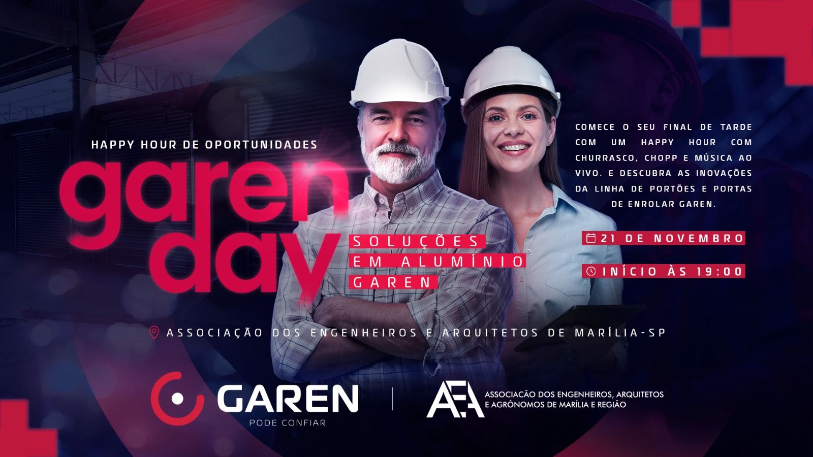 Garen Day, que será realizado na sede da Associação dos Engenheiros, Arquitetos e Agrônomos de Marília, proporcionará ótimas oportunidades de networkingHappy hour voltado para todos os engenheiros, arquitetos e agrônomos da região de Marília será promovido no próximo dia 21 de nove...