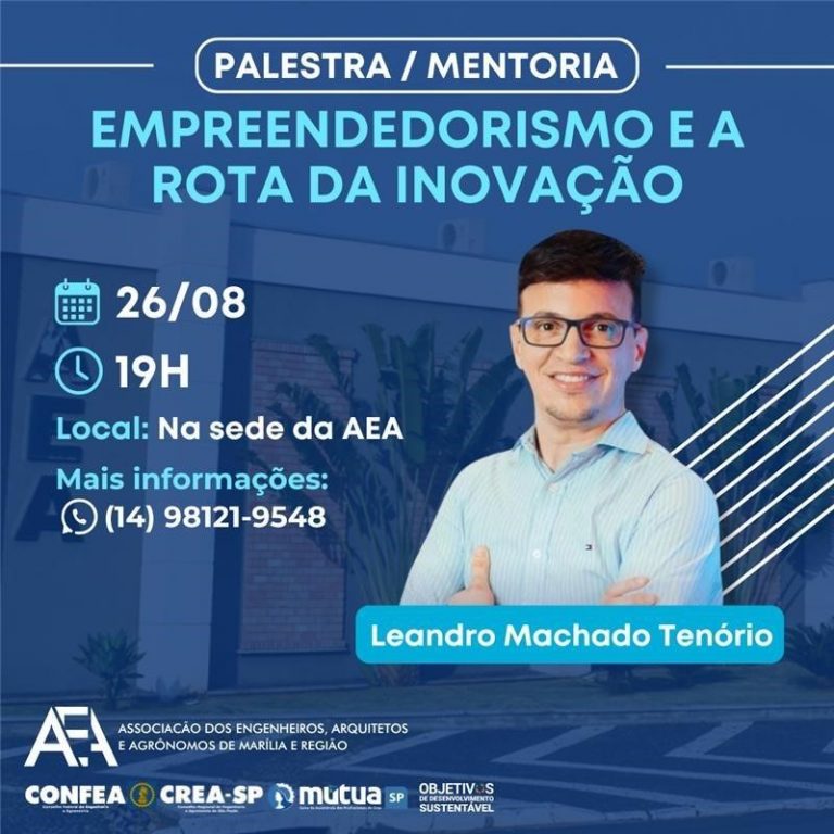 Palestra na Associação dos Engenheiros, Arquitetos e Agrônomos de Marília (AEA Marília) direcionará participantes na trilha da criatividade com inovação O especialista em finanças, consultor e assessor empresarial em Estratégias de Negócios, Inovação e Finanças Corporativas, Leandro M...