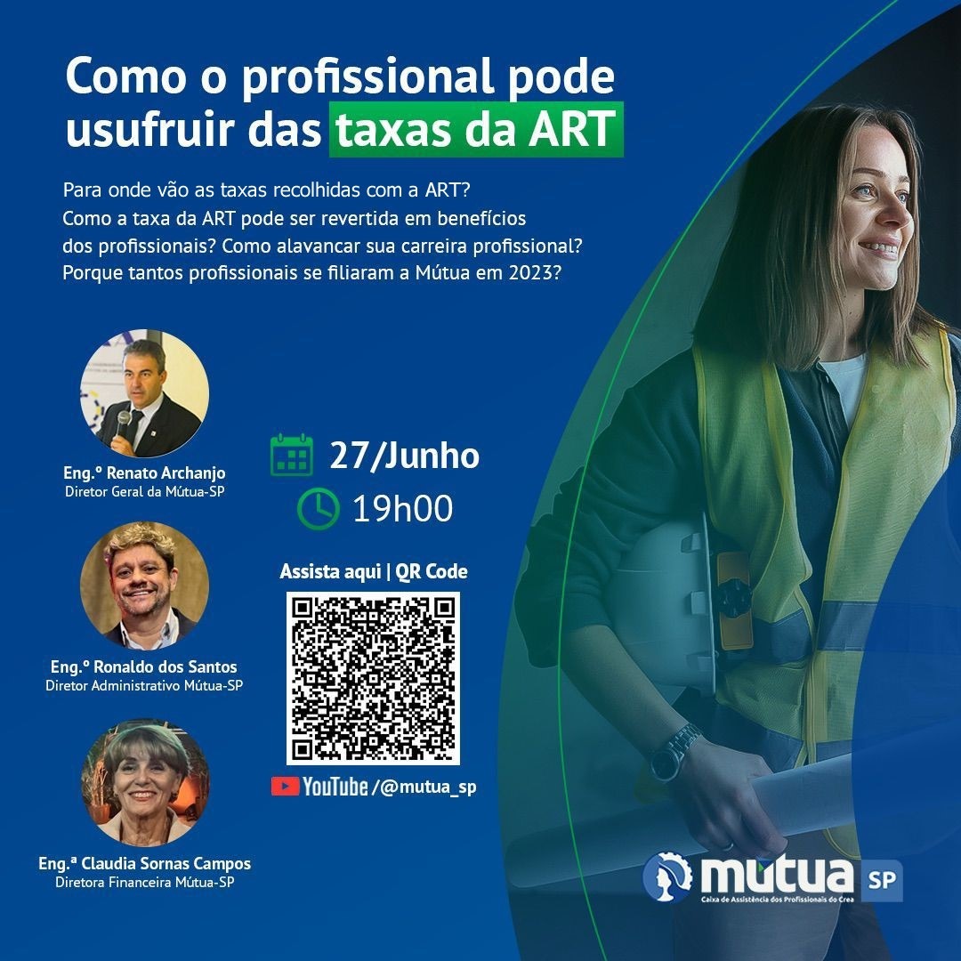 ‘Como o profissional pode usufruir das taxas da ART’ apresentará as vantagens e benefícios da Mútua SP nesta 3ª-feira
