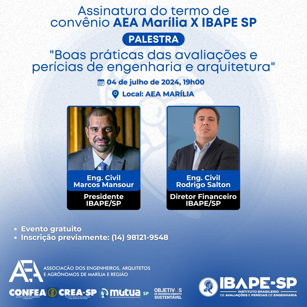 Os engenheiros civis, Marcos Mansour e Rodrigo Salton, diretores do IBAPE SP participam da solenidade no salão de eventos da Associaçãopor Mariano Rocha, @mariannorocha A Associação dos Engenheiros, Arquitetos e Agrônomos, a AEA Marília, amplia o portfólio de parcerias e benefícios aos...