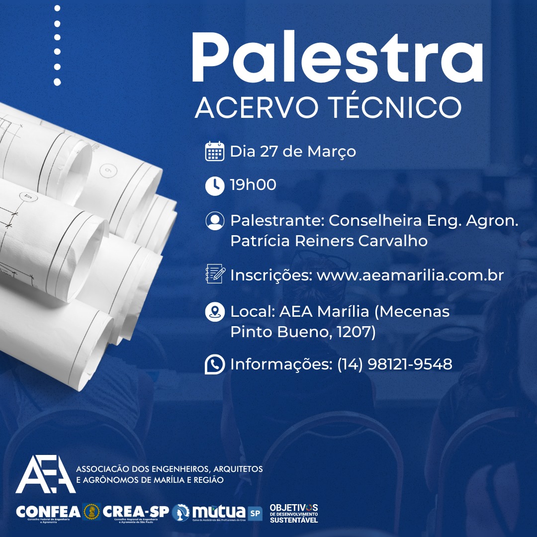 AEA MarÃlia, com apoio do Crea SP, Confea e Mútua SP, promove palestra sobre acervo técnico na próxima quarta-feira, dia 27As inscrições já estão abertas e podem ser feitas através do site www.aeamarilia.com.br. Conferência será ministrada pela doutora PatrÃcia Reiners Carvalho, engenhei...