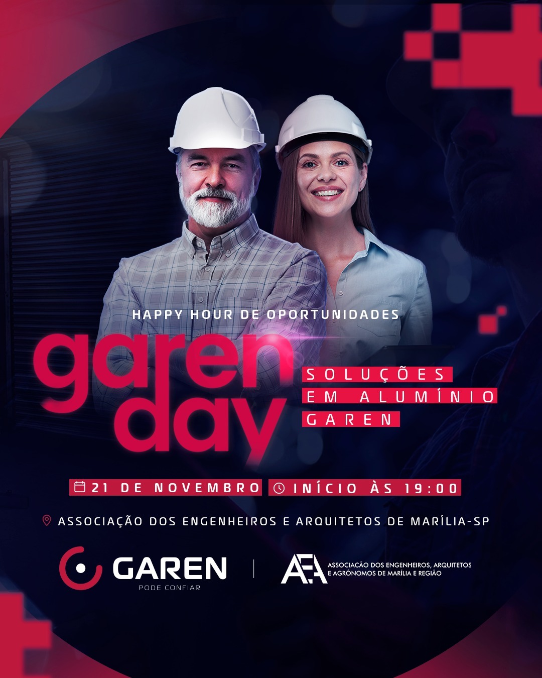 Garen Day, que será realizado na sede da Associação dos Engenheiros, Arquitetos e Agrônomos de Marília, proporcionará ótimas oportunidades de networkingHappy hour voltado para todos os engenheiros, arquitetos e agrônomos da região de Marília será promovido nesta quinta-feira, dia 21...
