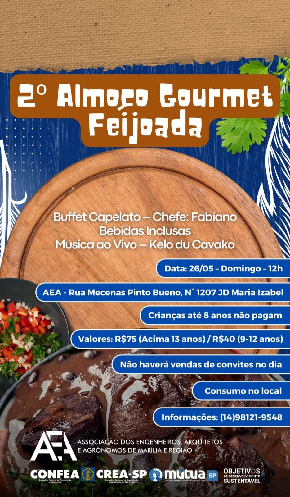 AEA de Marília organiza 2º Almoço Gourmet no próximo domingo, dia 26, e cardápio traz saborosa feijoada completa