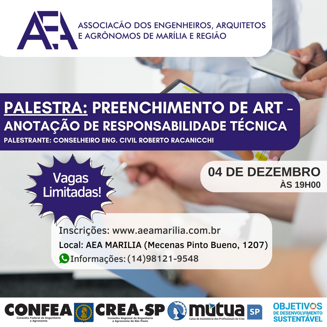 AEA MarÃlia realizará palestra sobre preenchimento da ART no dia 4 de dezembro