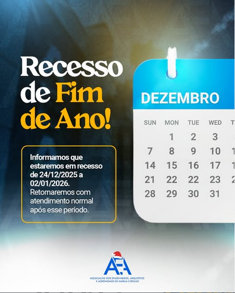 Atividades serão suspensas entre 24 de dezembro e 2 de janeiro. Diretoria agradece empenho de associados e colaboradores durante o ciclo que se encerraA Associação dos Engenheiros, Arquitetos e Agrônomos de Marília (AEA) informa que entrará em recesso oficial a partir desta quarta-feira, 24 de...