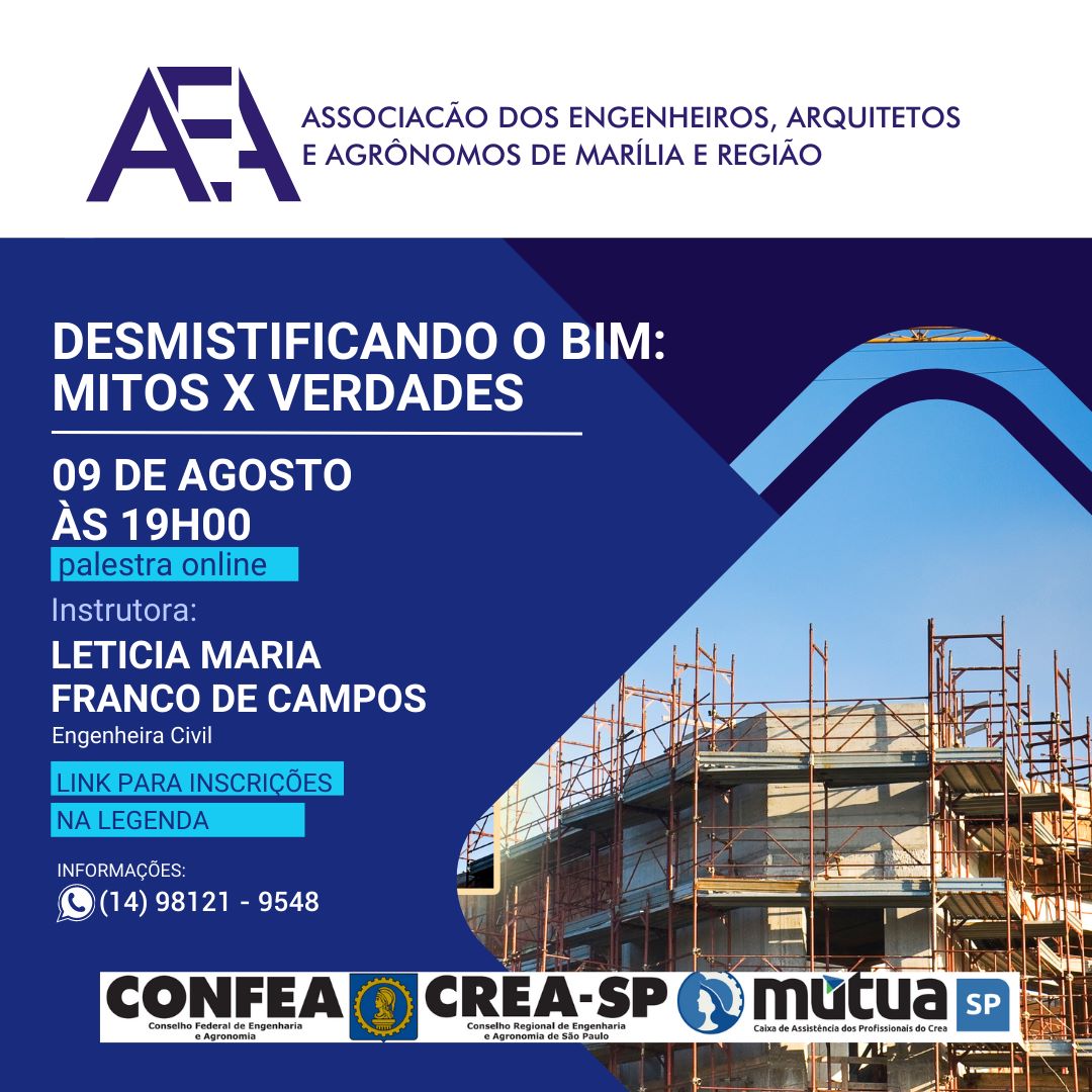 Mitos e verdades serão base da conferência com a engenheira civil Letícia Maria Franco de Campospor Agência Patmus Editorial A Associação dos Engenheiros, Arquitetos e Agrônomos de Marília (AEA Marília) realiza hoje, a partir das 19 horas, a palestra ‘Desmistificando o BIM: Mitos X V...