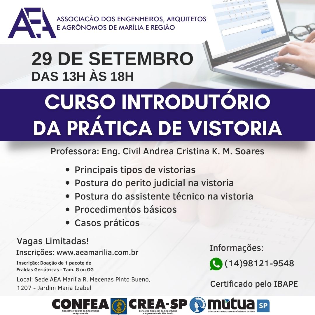 Treinamento acontecerá em 29 de setembro, das 13h às 18 horas, na entidade, rua Mecenas Pinto Bueno, nº 1207por Agência Patmus EditorialA Associação dos Engenheiros, Arquitetos e Agrônomos de Marília (AEA Marília) está com inscrições abertas para o curso introdutório da prática de vist...