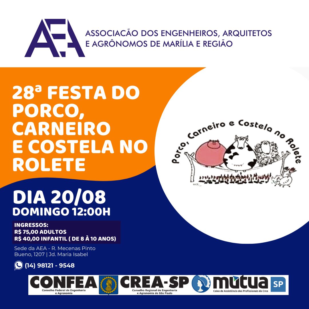 28ª edição do almoço do porco no rolete da AEA Marília acontece dia 20 de agosto em Marília