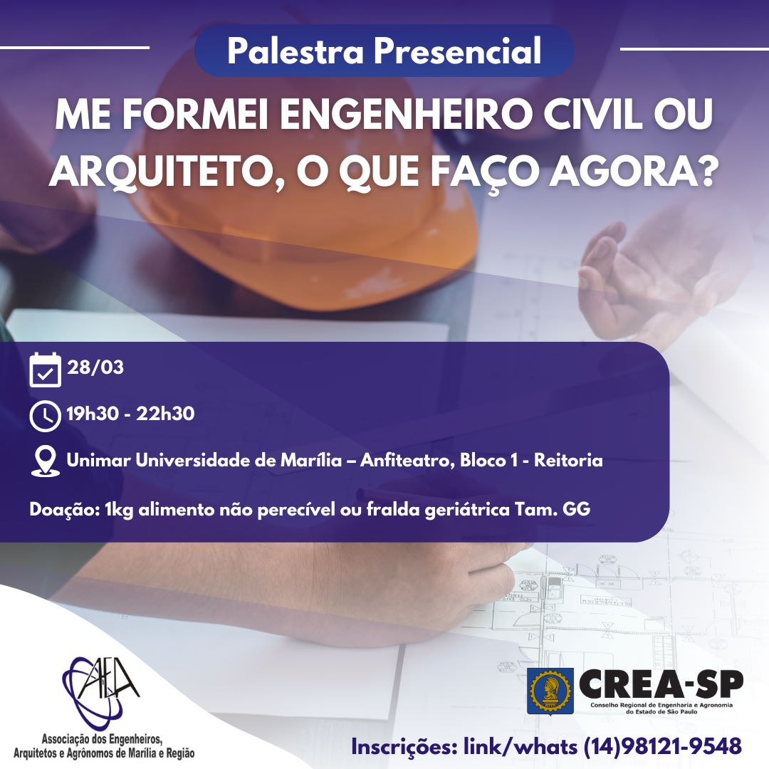 ‘Me formei e agora?’, com a engenheira Elaine Câmera, privilegia a formação continuada e a relevância do aperfeiçoamentoA Associação dos Engenheiros, Arquitetos e Agrônomos de Marília (AEA Marília) realiza nesta terça-feira, dia 28 de março, a palestra ‘Me formei e agora?’, inici...