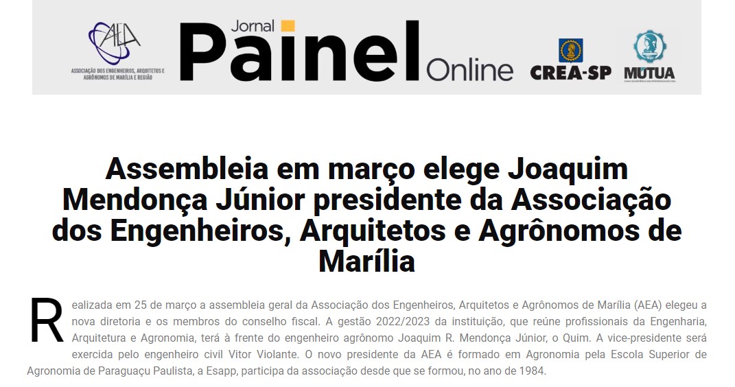O ano de 2022 marcou o inÃcio da nossa gestão à frente da Associação dos Engenheiros, Arquitetos e Agrônomos de MarÃlia, a nossa estimada AEA MarÃlia. Compromisso assumido com muita responsabilidade, aliás, compromisso compartilhado com toda a nossa diretoria. Diretoria formada por profissi...