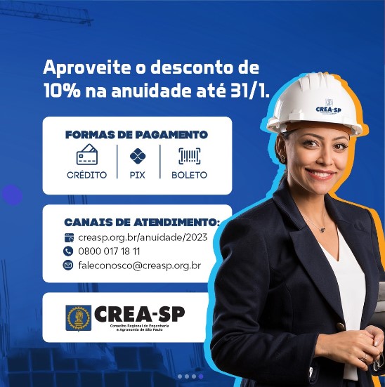 O Conselho Regional de Engenharia e Agronomia (Crea) São Paulo informa que desde o dia 6 deste mês está encaminhando por SMS o código de barras referente à anuidade 2023. As mensagens chegarão por este sistema até o próximo dia 14 de janeiro, contudo, desde o dia 9 de janeiro os boletos estÃ...