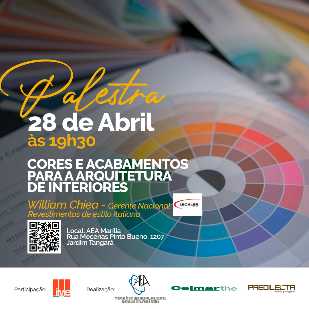A Associação dos Engenheiros, Arquitetos e Agrônomos de Marília (AEA Marília) promove nesta quinta-feira, dia 28 de abril, a partir das 19h30, em sua sede - à rua Mecenas Pinto Bueno, n.º 1.207, a palestra 'Cores e acabamentos para a Arquitetura de Interiores', com William Chiea. Chiea é ger...