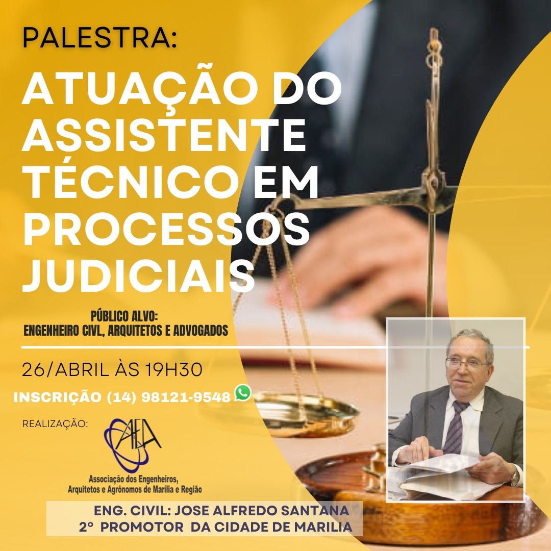 A Associação dos Engenheiros, Arquitetos e Agrônomos de Marília (AEA Marília) realiza na próxima terça-feira, dia 26 de abril, a palestra Atuação do Assistente Técnico em Processos Judiciais, que será ministrada pelo promotor de Justiça de Marília, José Alfredo de Araújo Sant'Anna, e...