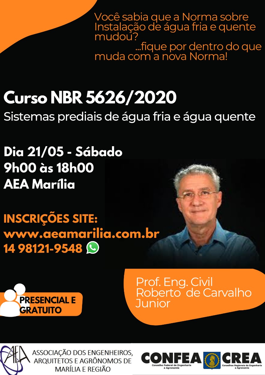 A Associação dos Engenheiros, Arquitetos e Agrônomos de Marília (AEA Marília) e o Crea São Paulo (Crea-SP) realizam no próximo dia 21 de maio, um sábado, o curso NBR 5626/2020, com o professor universitário e engenheiro civil Roberto de Carvalho Júnior. A NBR 5626/2020, é a norma que disc...