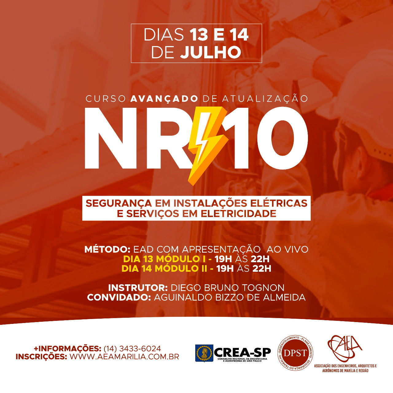 O instrutor Engenheiro Diego Tognon tem notoriedade no assunto e estará ministrando sobre a Atualização da NR10 - Segurança em Instalações Elétricas e Serviços em Eletricidade e também estará presente nosso convidado Engenheiro Aguinaldo Bizzo de Almeida. Faça sua inscrição aqui! ...